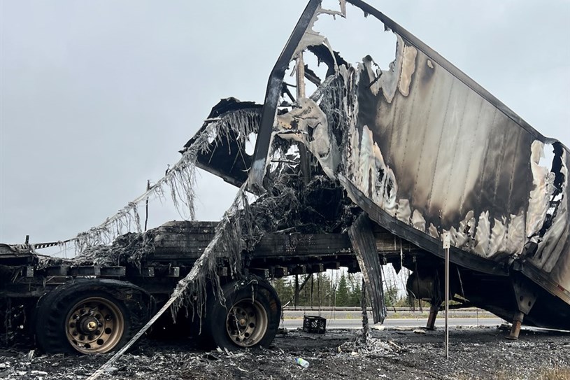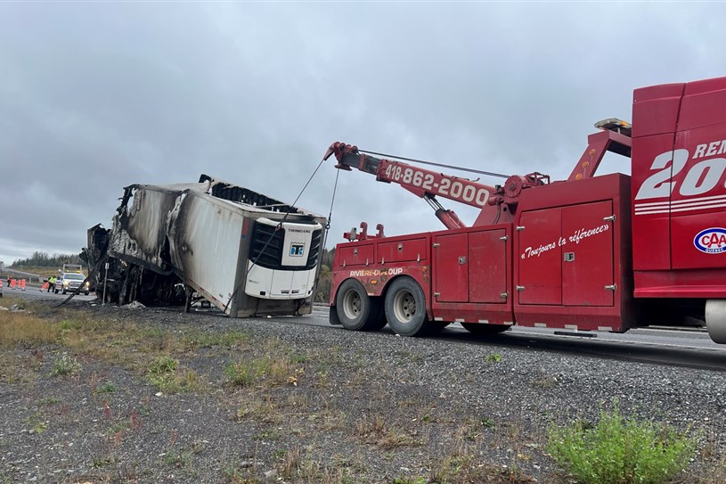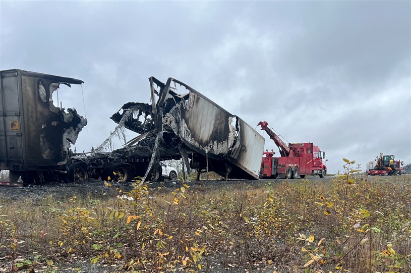 Un camion semi-remorque a été complètement ravagé par les flammes, hier, vers minuit, entre les kilomètres 43 et 44 sur l’autoroute 85 à Saint-Louis-du-Ha! Ha!.