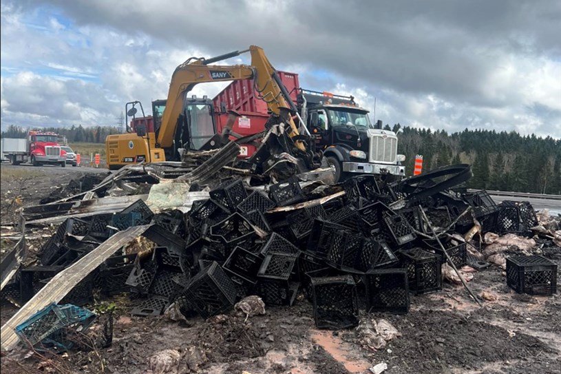 Le poids lourd, immatriculé de l’Île-du-Prince-Édouard, est une perte totale. Ce dernier, réfrigéré, transportait du lait au chocolat.